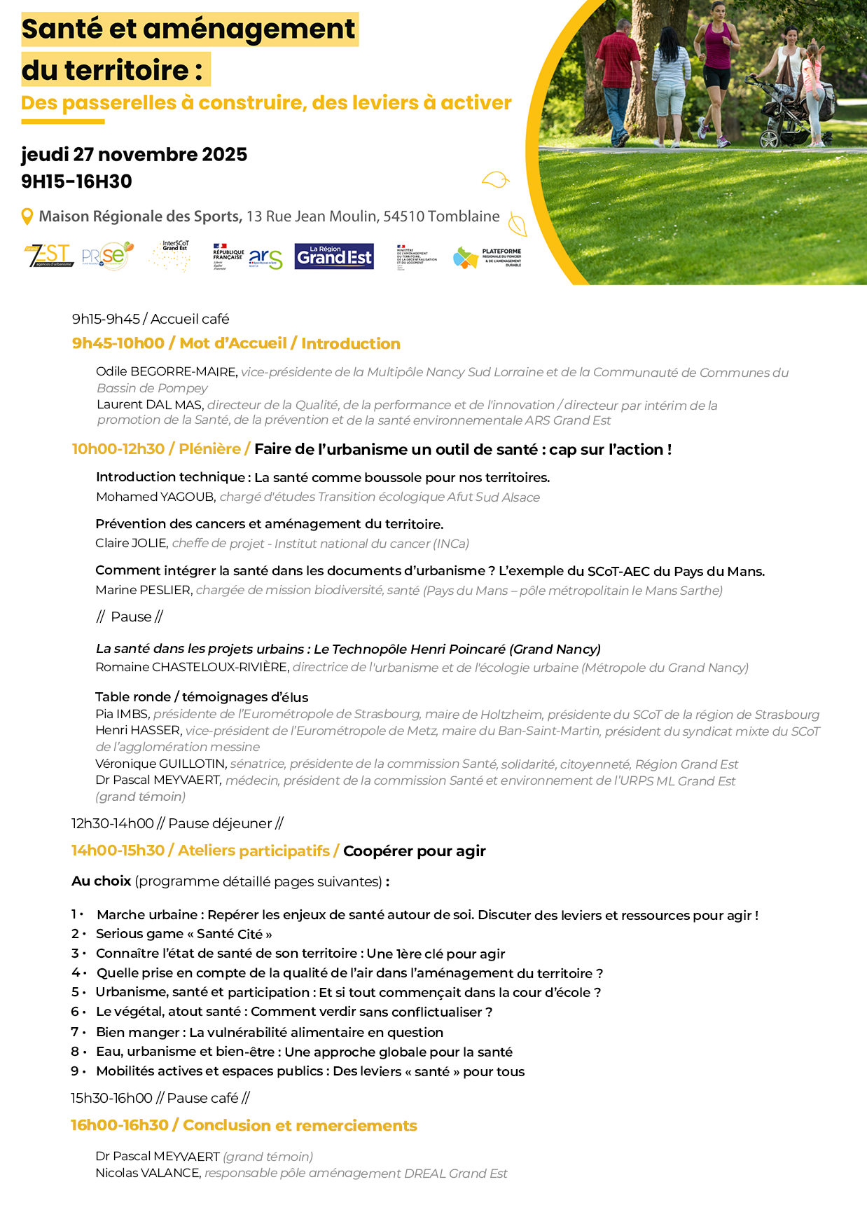 Le séminaire « Santé et aménagement du territoire : Des passerelles à construire, des leviers à activer » se tiendra le jeudi 27 novembre 2025, de 9h15 à 16h30, à la Maison Régionale des Sports de Tomblaine. Il réunira élus, professionnels de santé, urbanistes et acteurs du territoire pour réfléchir à l’intégration de la santé dans les projets d’aménagement urbain.